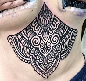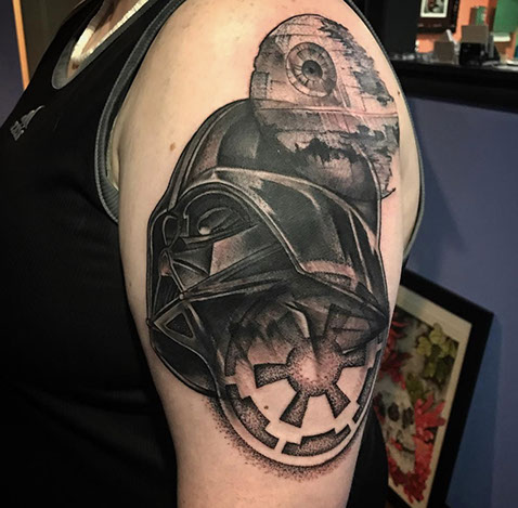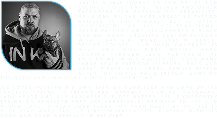 Jes Stricler ﷯JES IS A SELF TAUGHT TATTOO ARTIST AND CREDITS HIS CLIENTS, FRIENDS AND OTHER TATTOOERS FOR PUSHING HIS CREATIVITY. HE IS ONE OF THE MOST VERSATILE TATTOO ARTISTS IN THE MIDWEST BUT IS OFTEN RECOGNIZED FOR HIS NEO-TRADITIONAL COLOR TATTOOS AND HIS GEOMETRIC BLACK AND DOTWORK. CREATING CUSTOM TATTOOS WITH CLEAN LINE WORK, LOTS OF BLACK, BRIGHT COLORS, AND HIGH CONTRAST IS WHAT YOU WILL FIRST NOTICE WHEN LOOKING THROUGH JES'S PORTFOLIO. AT THIS POINT IN HIS CAREER HE DOES MANY LARGE SCALE TATTOOS (SLEEVES, BACK AND CHEST PIECES, FULL LEGS), ALWAYS PAYING ATTENTION TO THE WAY A TATTOO FLOWS ON THE BODY AND HOW IT WILL HOLD UP OVER TIME. JES LOVES PUTTING HIS OWN SPIN ON YOUR IDEA AND SOME OF HIS FAVORITE THINGS TO TATTOO ARE: ANIMALS, FLOWERS, MANDALAS, LADY HEADS AND ANY JAPANESE SUBJECT MATTER. JES IS CURRENTLY TAKING ON PROJECTS THAT ARE CREATIVELY INSPIRING TO HIM AND WOULD LOVE TO HEAR YOUR IDEAS FOR YOUR NEXT TATTOO. JES IS HUGE STAR WARS FAN, HE LIKES WORKING OUT, PLAYING WITH HIS DOGS AND FOUR WHEELING IN HIS JEEP.